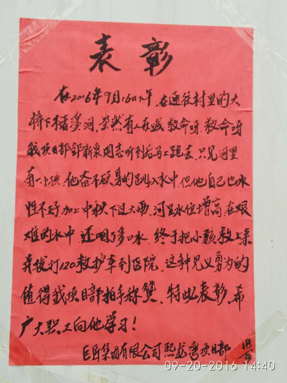 鄒新泉救人的事情很快在項目部傳開了,項目部通過紅榜給他表彰,聽說還要給他獎勵,他婉言謝絕,說那天換了我們項目部的其他同事也一樣會這么做。