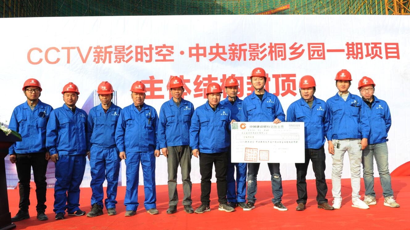 CCTV新影時空·中央新影桐鄉(xiāng)園一期項目總建筑面積54000M2(其中地上40000M2、地下14000 M2),地下1層,地上13層。項目于2015年12月31日項目奠基,施工過程中,項目部全力以赴,克服重重困難,保安全、重質(zhì)量、搶進度,在各方主體的支持、監(jiān)管和全體施工人員的共同努力下,于2016年10月30日提前完成地下室頂板澆筑,2017年1月20日又比預(yù)定目標(biāo)提前4天完成主體結(jié)構(gòu)封頂,高速、高效得完成主體施工任務(wù),得到了各級領(lǐng)導(dǎo)的充分肯定和建設(shè)單位的高度認(rèn)可。儀式上,項目部當(dāng)即受到了建設(shè)單位100萬元的嘉獎。