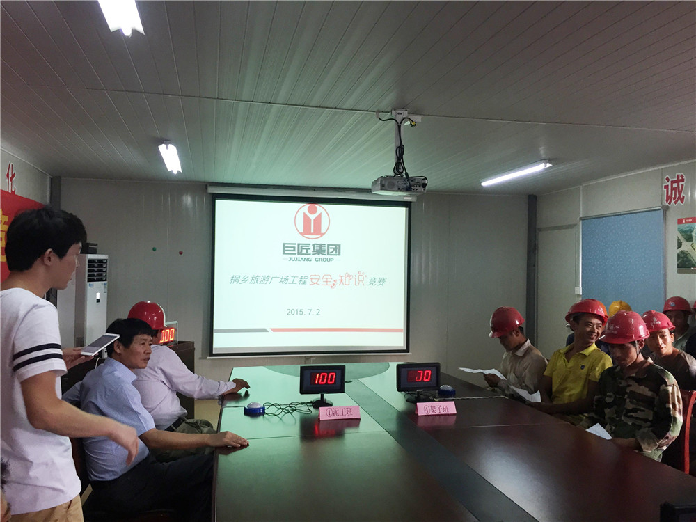 2015-07-03 工人參與安全知識競賽 真正讓安全意識扎根于心 7月2日下午,桐鄉市旅游廣場工程會議室人頭撰動、掌聲不斷。這里正在舉行一場別開生面的安全知識競賽。參賽的選手全部來自施工一線的工人,參加比賽的各隊分別是泥工班組、木工班組、鋼筋工班組、架子工班組組成的四...